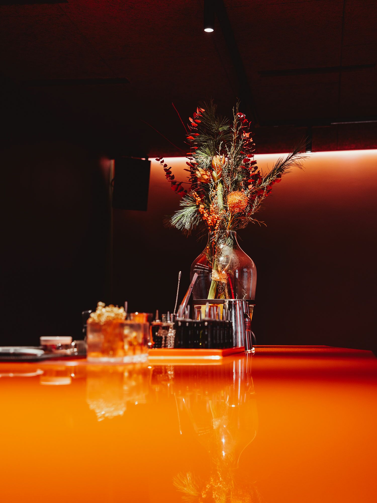Die Theke erhielt eine neue Lackierung sowie eine passgenaue Mineralwerkstoff-Platte. Der WC-Bereich wurde mit einem lackierten MDF-Waschtischunterschrank und einem farblich abgestimmten Betonwaschbecken neu gestaltet. Ergänzt wird das Projekt durch rosé lackierte Türen, Beistelltische aus schwarz gebeizter Eiche sowie maßgefertigte Sitzbänke mit integrierter Subwoofer-Lösung.