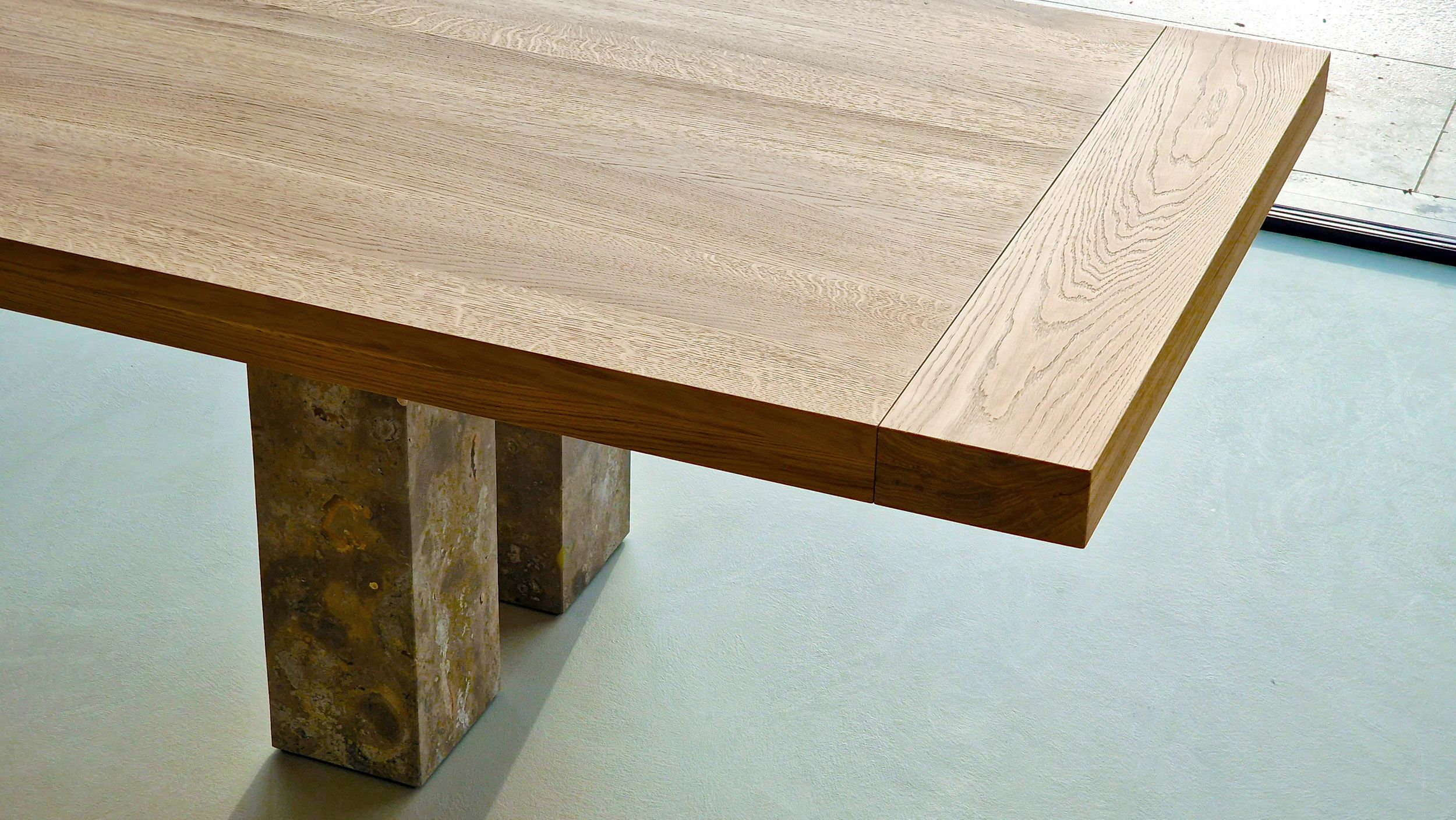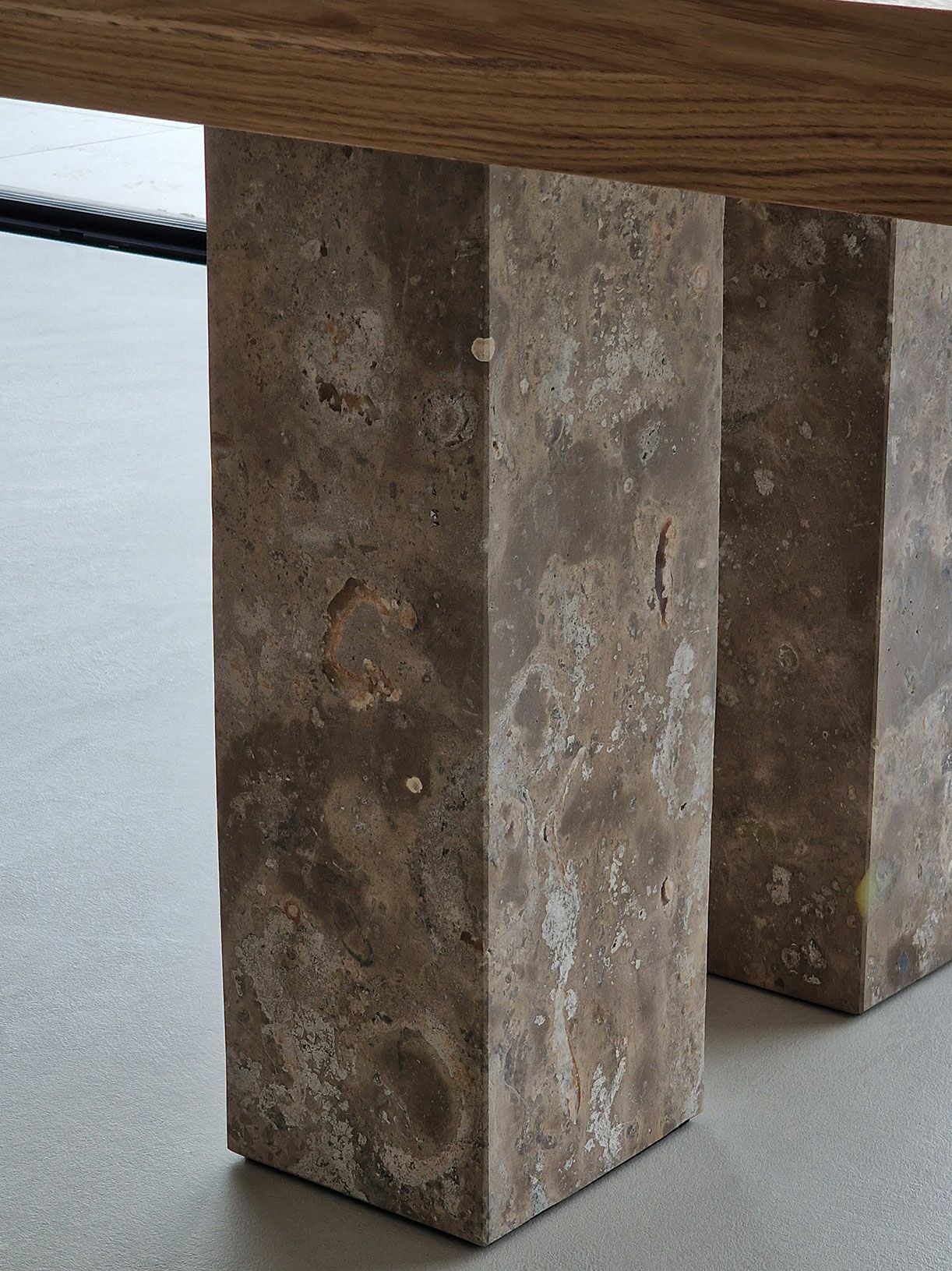Dieser außergewöhnliche Esstisch (400 x 110 cm) überzeugt durch seine einzigartige Materialkombination, die Design und Natürlichkeit perfekt miteinander vereint. Die Verbindung von edlem Naturstein, warm schimmerndem Messing und einer massiven Eichenholzplatte hebt den Tisch aus der Masse heraus und macht ihn zu einem echten Designstatement. Besonders harmonisch wirkt der Tisch, da der verwendete Naturstein an anderen Stellen des Raumes wieder aufgegriffen wird. Dadurch entsteht ein Gesamtkonzept, das wie aus einem Guss erscheint und den Tisch nahtlos in das Interieur integriert. Ein Möbelstück, das nicht nur durch Funktionalität, sondern auch durch zeitlose Eleganz beeindruckt.