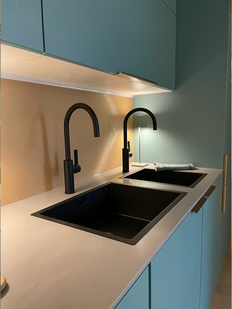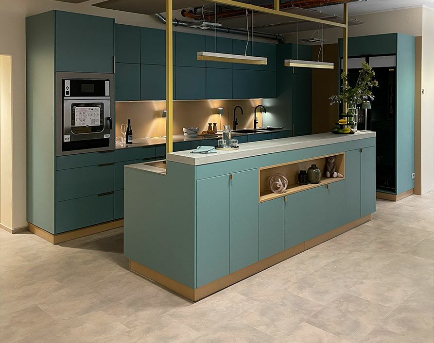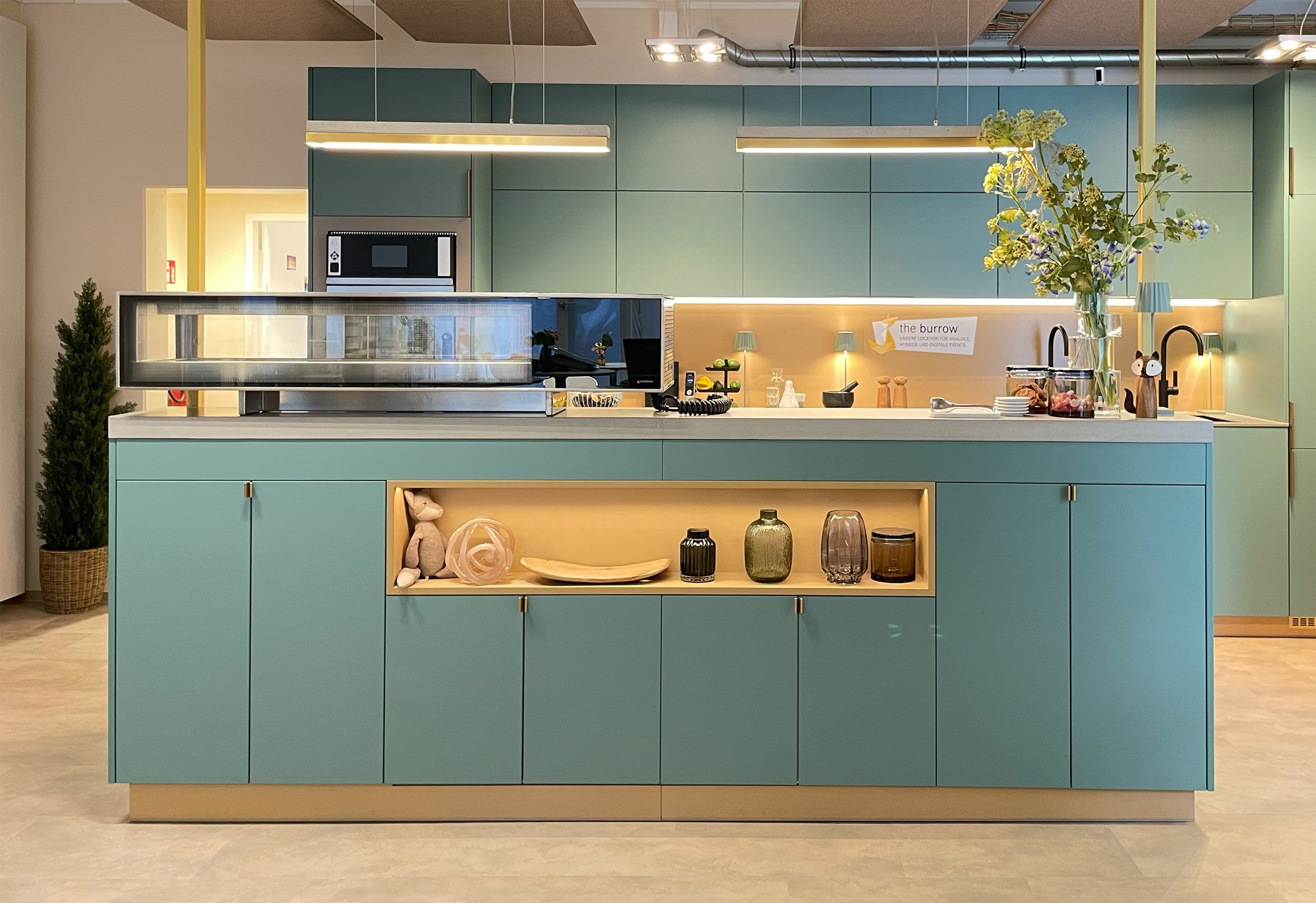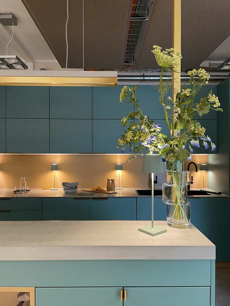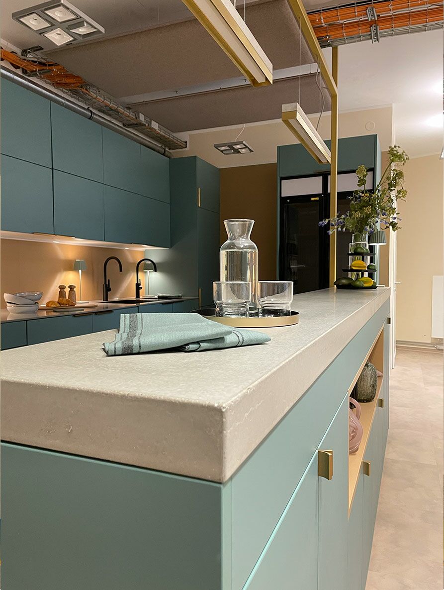 Für eine vielseitig nutzbare Eventlocation, die auch für Meetings angemietet werden kann, haben wir eine stilvolle Küche gestaltet. Die Arbeitsflächen aus poliertem Beton überzeugen nicht nur durch ihre moderne Ästhetik, sondern auch durch ihre Widerstandsfähigkeit gegenüber Flüssigkeiten. Die agavengrünen Schichtstoff-Fronten der Küchenschränke harmonieren perfekt mit dem warmen Grau des Betons und den edlen Messingakzenten. Ergänzt wird das Design durch sorgfältig ausgewählte Lampen von Gant Lights und hochwertige Armaturen von Tapwell, die das Ensemble stimmig abrunden.
