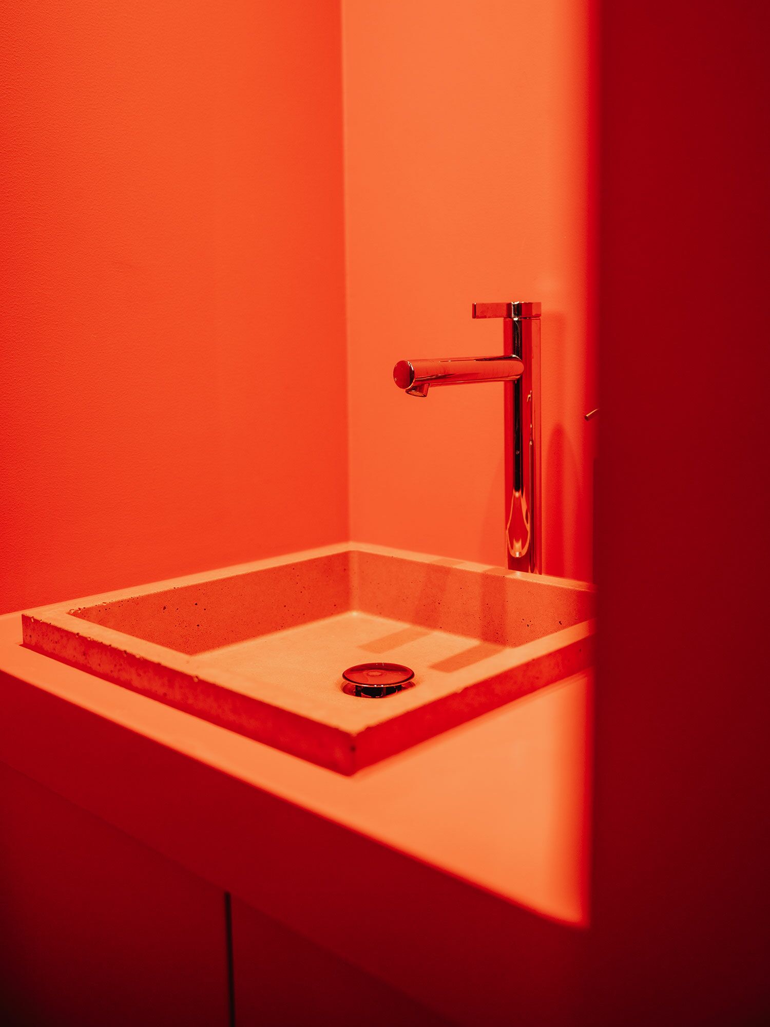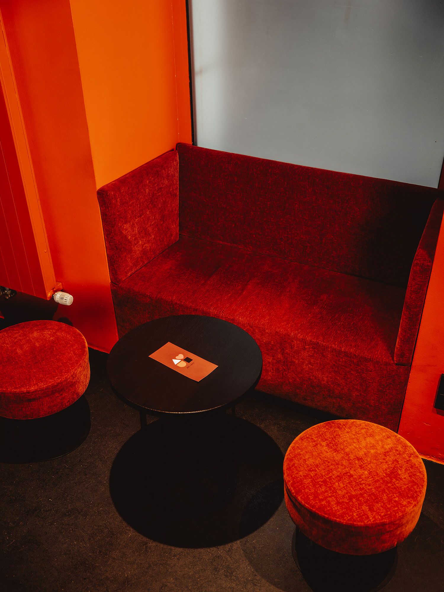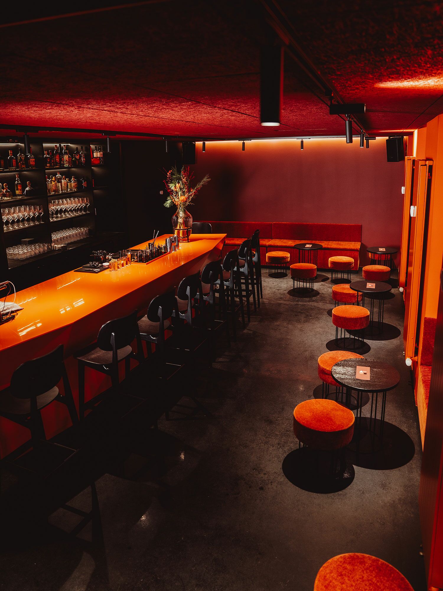 Die Theke erhielt eine neue Lackierung sowie eine passgenaue Mineralwerkstoff-Platte. Der WC-Bereich wurde mit einem lackierten MDF-Waschtischunterschrank und einem farblich abgestimmten Betonwaschbecken neu gestaltet. Ergänzt wird das Projekt durch rosé lackierte Türen, Beistelltische aus schwarz gebeizter Eiche sowie maßgefertigte Sitzbänke mit integrierter Subwoofer-Lösung.