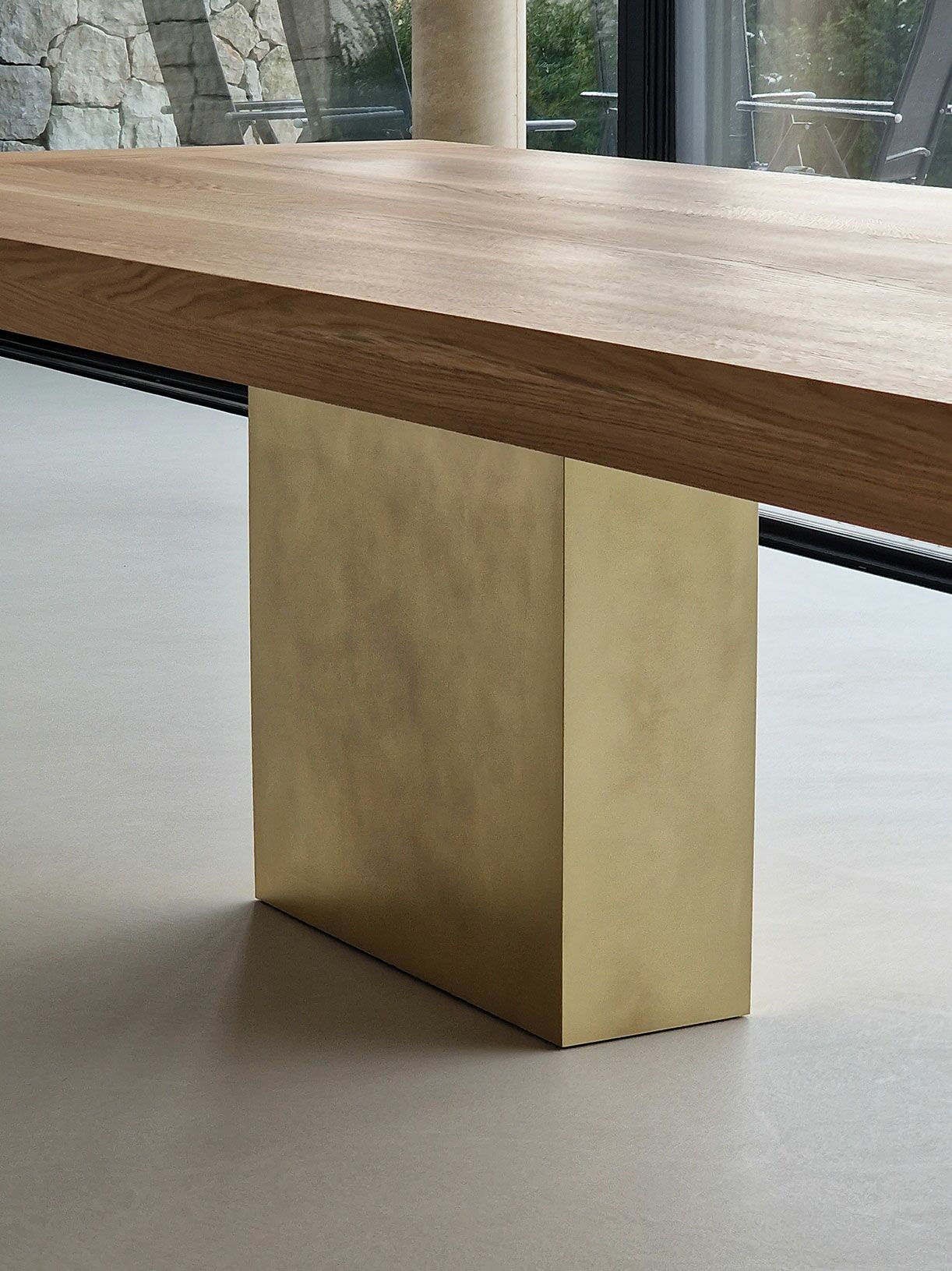 Dieser außergewöhnliche Esstisch (400 x 110 cm) überzeugt durch seine einzigartige Materialkombination, die Design und Natürlichkeit perfekt miteinander vereint. Die Verbindung von edlem Naturstein, warm schimmerndem Messing und einer massiven Eichenholzplatte hebt den Tisch aus der Masse heraus und macht ihn zu einem echten Designstatement. Besonders harmonisch wirkt der Tisch, da der verwendete Naturstein an anderen Stellen des Raumes wieder aufgegriffen wird. Dadurch entsteht ein Gesamtkonzept, das wie aus einem Guss erscheint und den Tisch nahtlos in das Interieur integriert. Ein Möbelstück, das nicht nur durch Funktionalität, sondern auch durch zeitlose Eleganz beeindruckt.