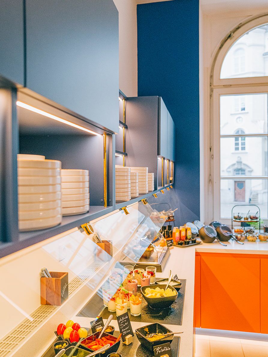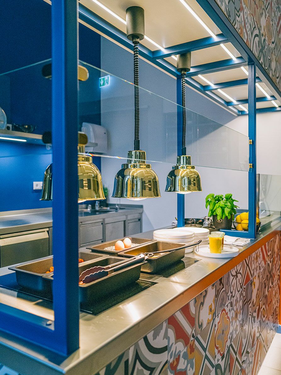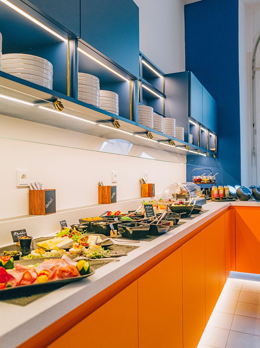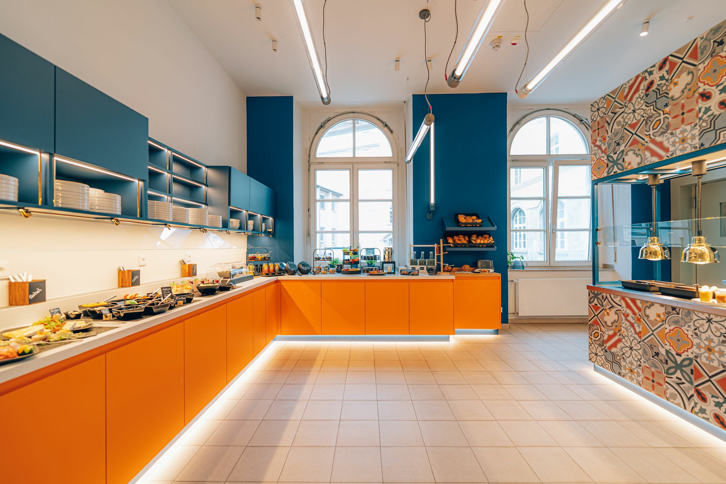 Frühstücksküche und maßgefertigte Theke (Design: Kitzig Design Studios) für das Hotel Amalia in Landshut. Die Kombination aus farbenfrohen Fliesen, orangen und blauen Fronten sowie schlichten, robusten Betonflächen stellte eine besondere gestalterische Herausforderung dar, die wir mit großer Sorgfalt und Liebe zum Detail gemeistert haben. Das Ergebnis ist ein harmonisches Zusammenspiel aus Funktionalität und Ästhetik, das den Raum in eine inspirierende und zugleich praktische Umgebung verwandelt. Dieses Projekt zeigt, wie durch die gelungene Verbindung unterschiedlicher Materialien ein einzigartiges Design entstehen kann.