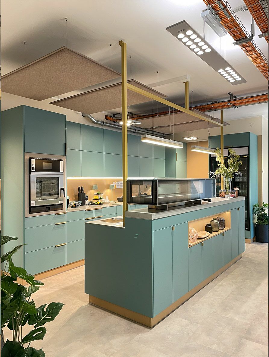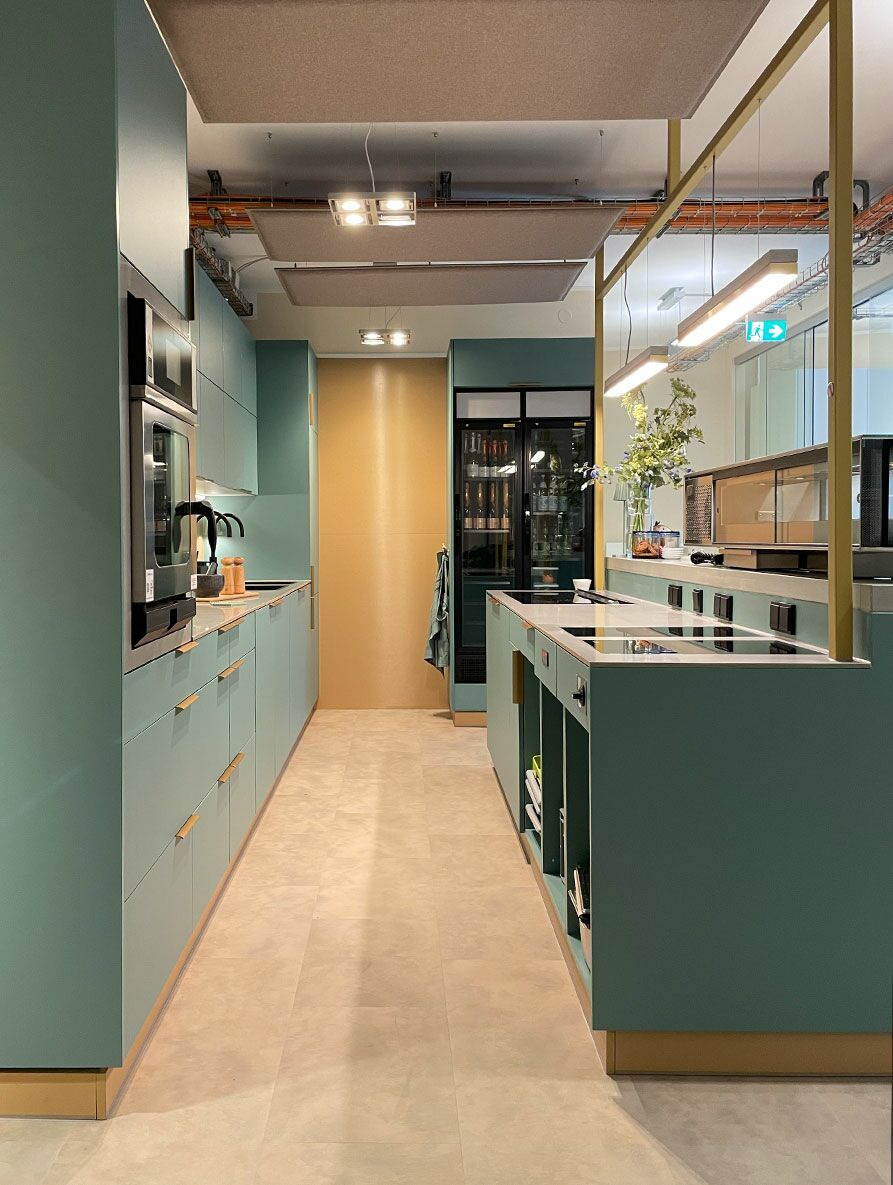 Für eine vielseitig nutzbare Eventlocation, die auch für Meetings angemietet werden kann, haben wir eine stilvolle Küche gestaltet. Die Arbeitsflächen aus poliertem Beton überzeugen nicht nur durch ihre moderne Ästhetik, sondern auch durch ihre Widerstandsfähigkeit gegenüber Flüssigkeiten. Die agavengrünen Schichtstoff-Fronten der Küchenschränke harmonieren perfekt mit dem warmen Grau des Betons und den edlen Messingakzenten. Ergänzt wird das Design durch sorgfältig ausgewählte Lampen von Gant Lights und hochwertige Armaturen von Tapwell, die das Ensemble stimmig abrunden.